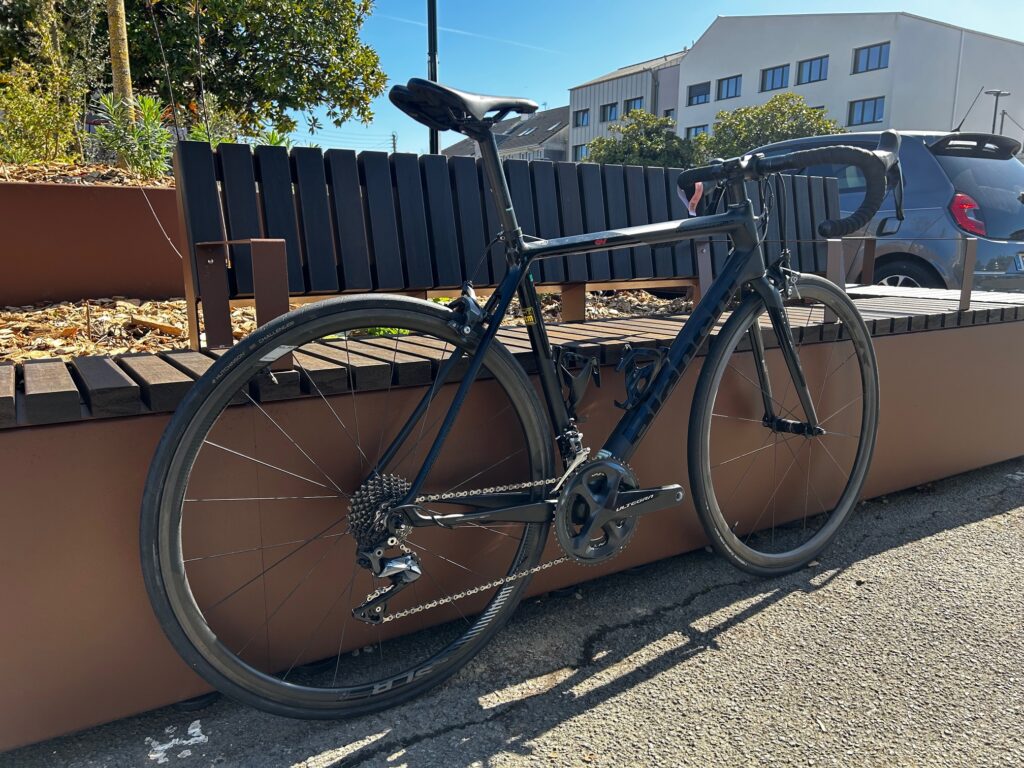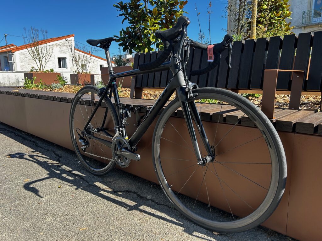 Équipé d’un groupe Shimano Ultegra mécanique et de freins sur jante, ce vélo reste précis, léger et efficace en montée comme sur le plat.